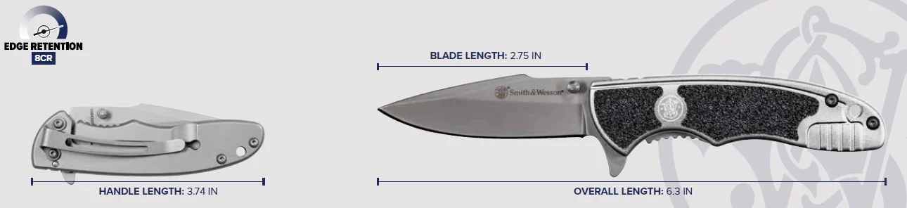 The S&W Drop Point Folding Knife features aluminum handle scales with textured inlays, a 2.67in stainless steel blade, flipper tab and thumb stud deployment, and a tip-down carry pocket clip.
