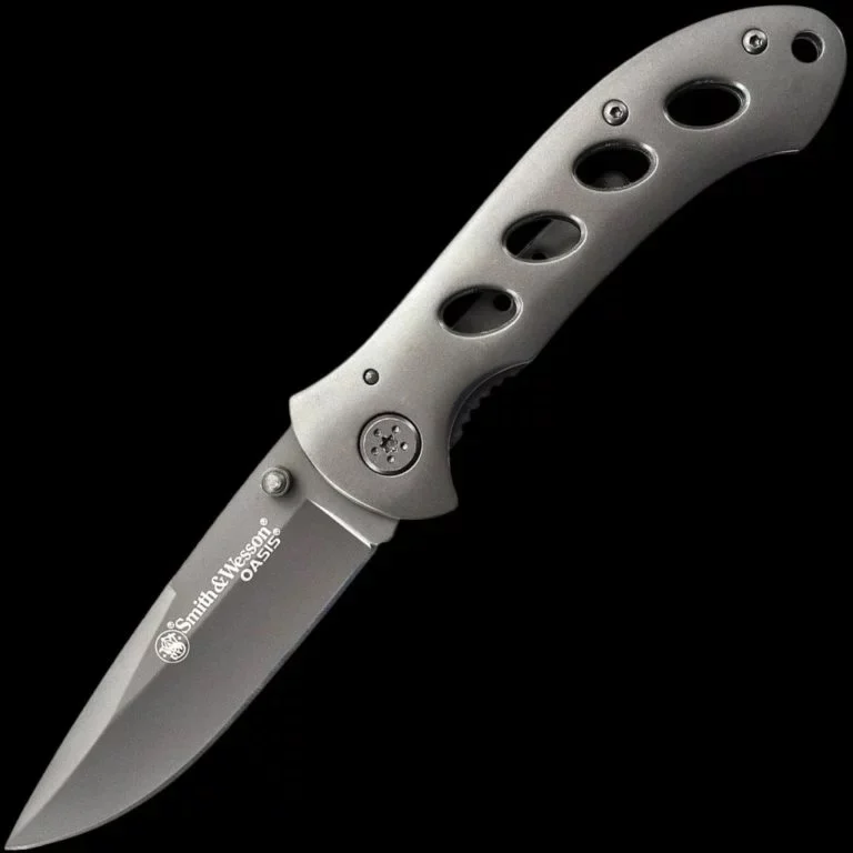 Folding 7Cr17MoV stainless steel Ti-coated plain drop point blade with grey stainless steel handles. Also features a liner lock mechanism and pocket clip.