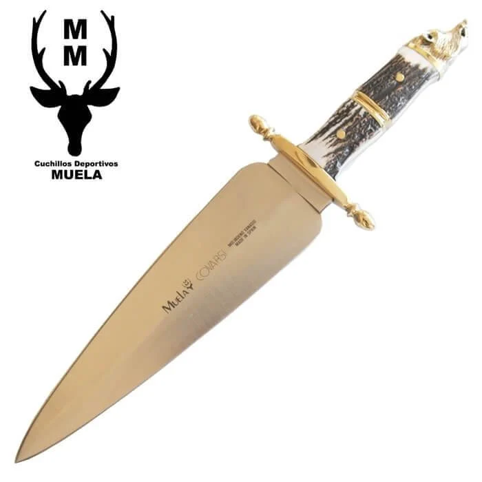 245mm blade, stag deer scales, brass wild boar head cap and guard, Leather & Brass Ferrules