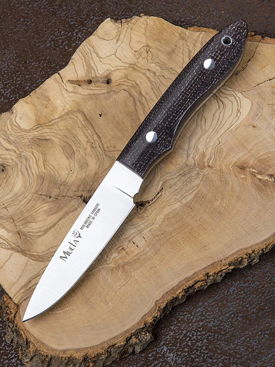 Brown jute micarta handles, it comes with a hole for a safety cord and a MoVa steel blade.